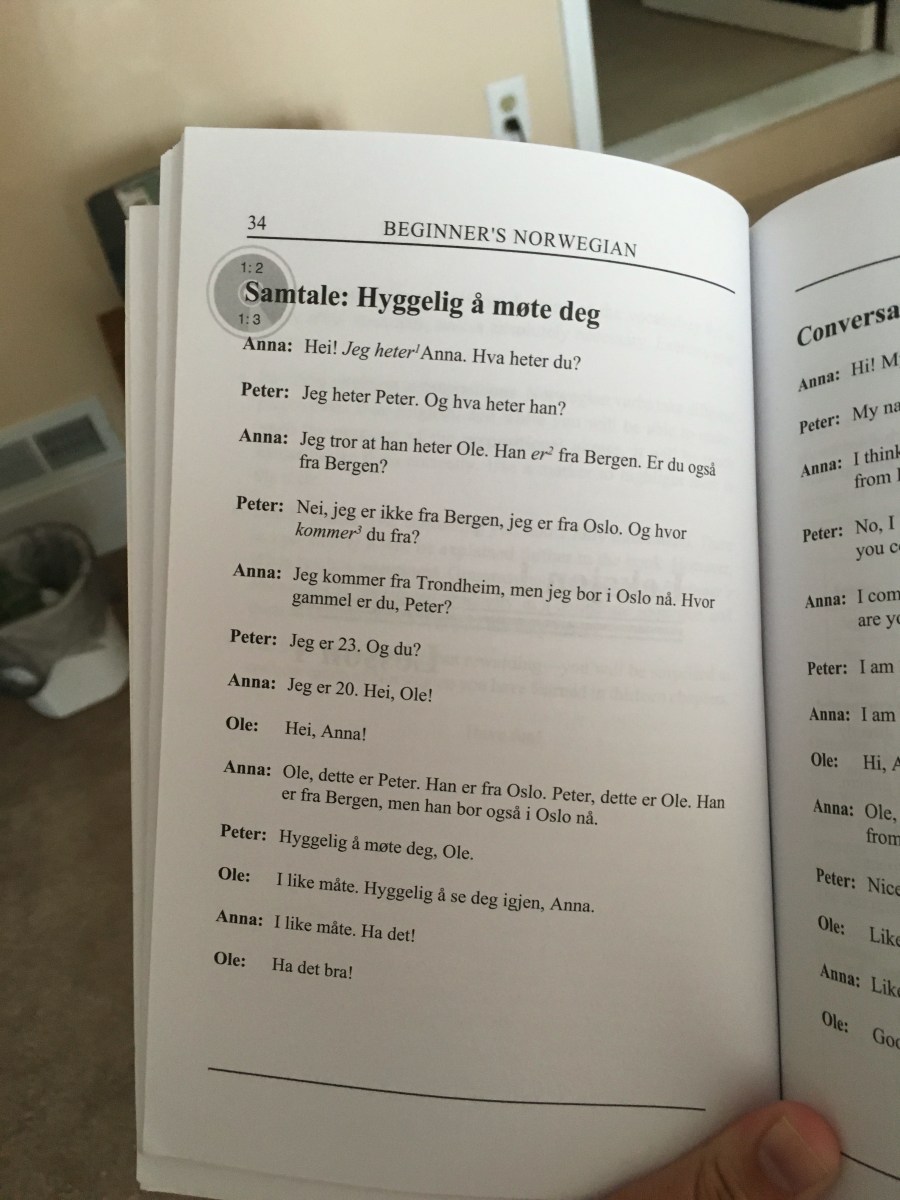 First, I think I made a mistake in getting something made for absolute beginners. As someone who has learned Danish for over three years, I found that I was bored with the overall pace and the depth of the grammar sections. Even though Danish and Norwegian are very similar, at least in written form, there are some small, but important differences, as far as grammar is concerned, particularly when it comes to spelling rules and patterns. But there are some things I appreciated about this book. For example, after every dialogue it repeats the entire dialogue for repetition, sentence by sentence, or for the longer sentences, phrase by phrase. I can be quite a perfectionist about my pronunciation, which I admit could use quite some improvement, so this really helped get pretty good feel of Norwegian speech. Although written Danish and Norwegian are similar enough so that someone that knows one language can read the other, the pronunciation is quite different. This was the main reason, I decided to do a separate study of the Norwegian language, instead of simply using my Danish knowledge to read and to write with my Norwegian friends.
