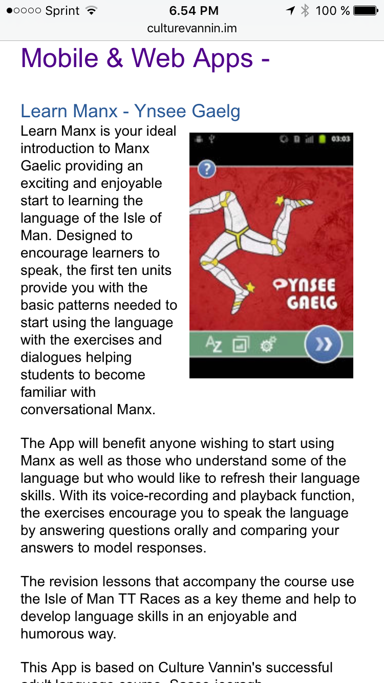 Sadly, due to the relatively small number of speakers, resources to learn the Manx language are not as plentiful as for most commonly known languages. However, do not let that stop you from trying. The upside is that all the resources I have come across so far cost nothing, which includes a neat app for your iPhone (also available in the Google Play store.