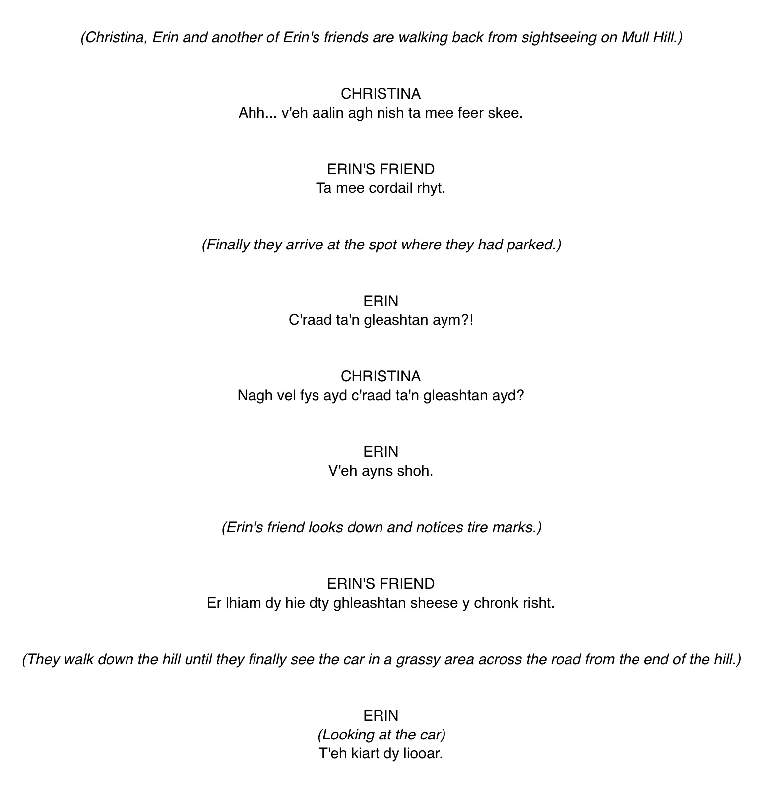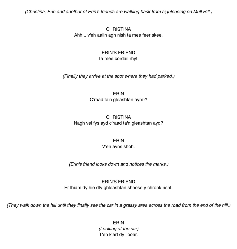 Er lhiam dy hie dty ghleashtan sheese y chronk risht.I think your car went down the hill again.