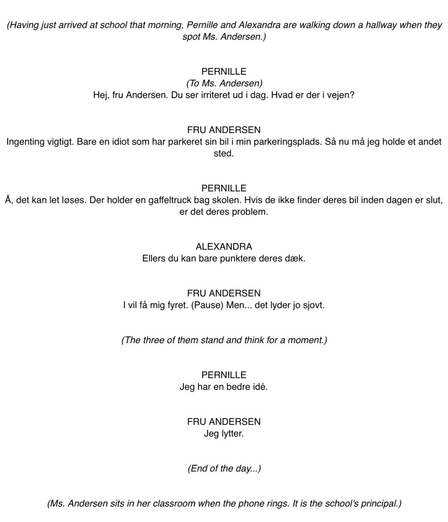 Å, det kan let løses. Der holder en gaffeltruck bag skolen. Hvis de ikke finder deres bil inden dagen er slut, er det deres problem. Ah, that can be easily solved. There’s a forklift behind the school. If they don’t find their car by the end of the day, that’s their problem.