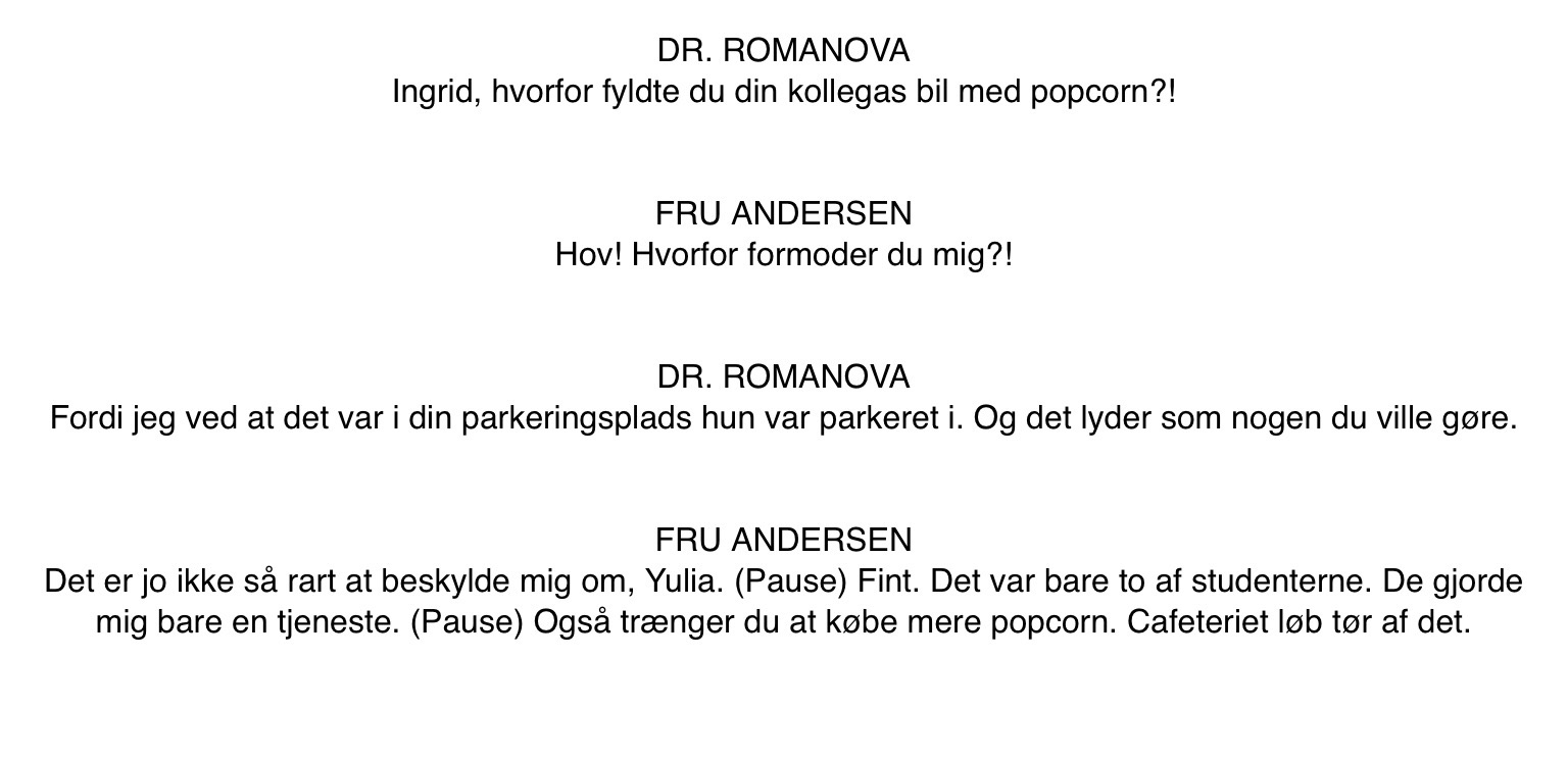 Det er jo ikke så rart at beskylde mig om, Yulia. Fint. Det var bare to af studenterne. De gjorde mig bare en tjeneste. Også trænger du at købe mer popcorn. Cafeteriet løb tør af det. It’s not (so) nice to accuse me, Yulia. Fine. It was two of the students. They were just doing me a favor. Also, you need to buy more popcorn. The cafeteria ran out (of it).