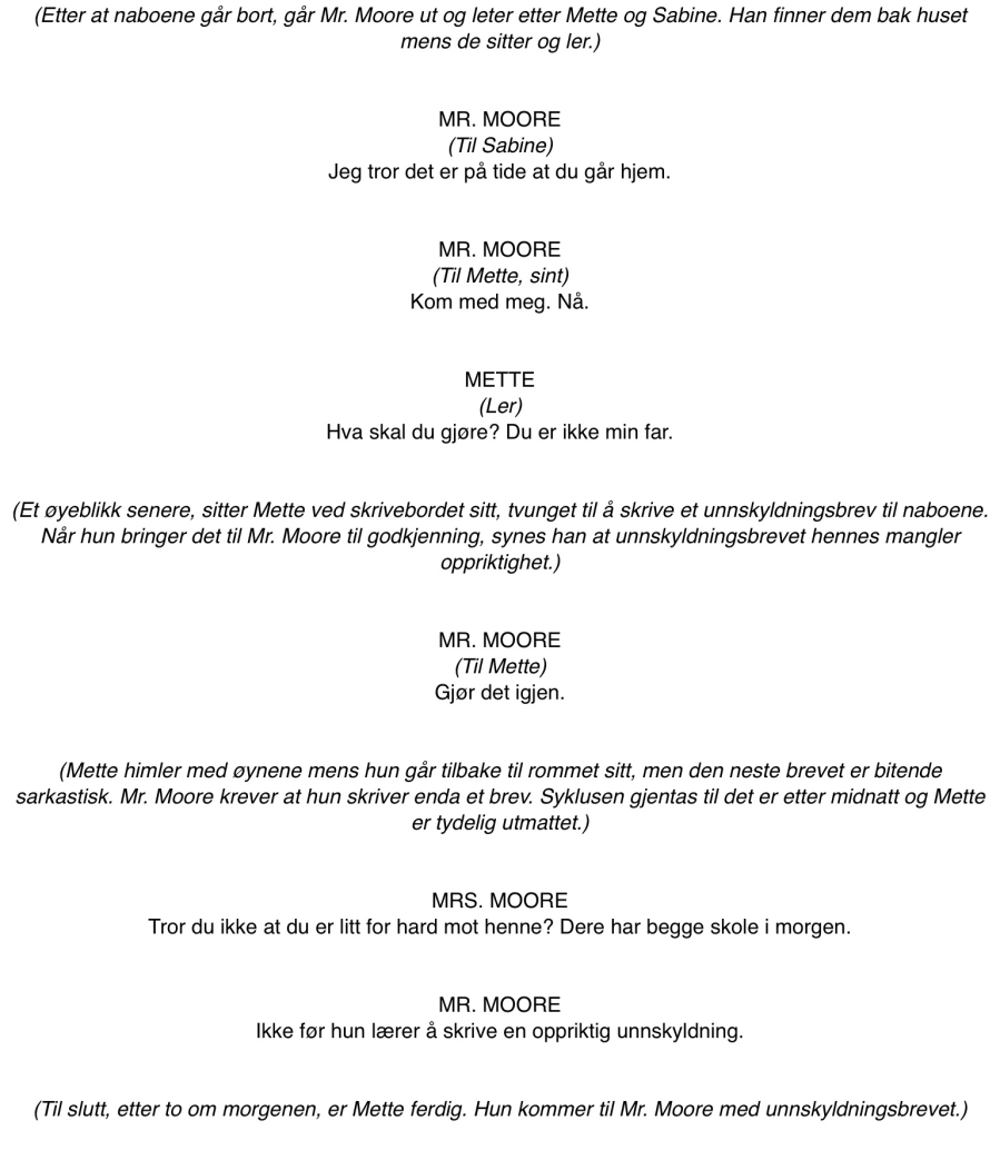 Mette himler med øynene mens hun går tilbake til rommet sitt, men den neste brevet er bitende sarkastisk. Mr. Moore krever at hun skriver enda et brev. Syklusen gjentas til det er etter midnatt og Mette er tydelig utmattet. Mette rolls her eyes as she goes back to her room, but the next letter is dripping with sarcasm. Mr. Moore makes her write yet another letter. The cycle repeats until it is past midnight and Mette is clearly exhausted.