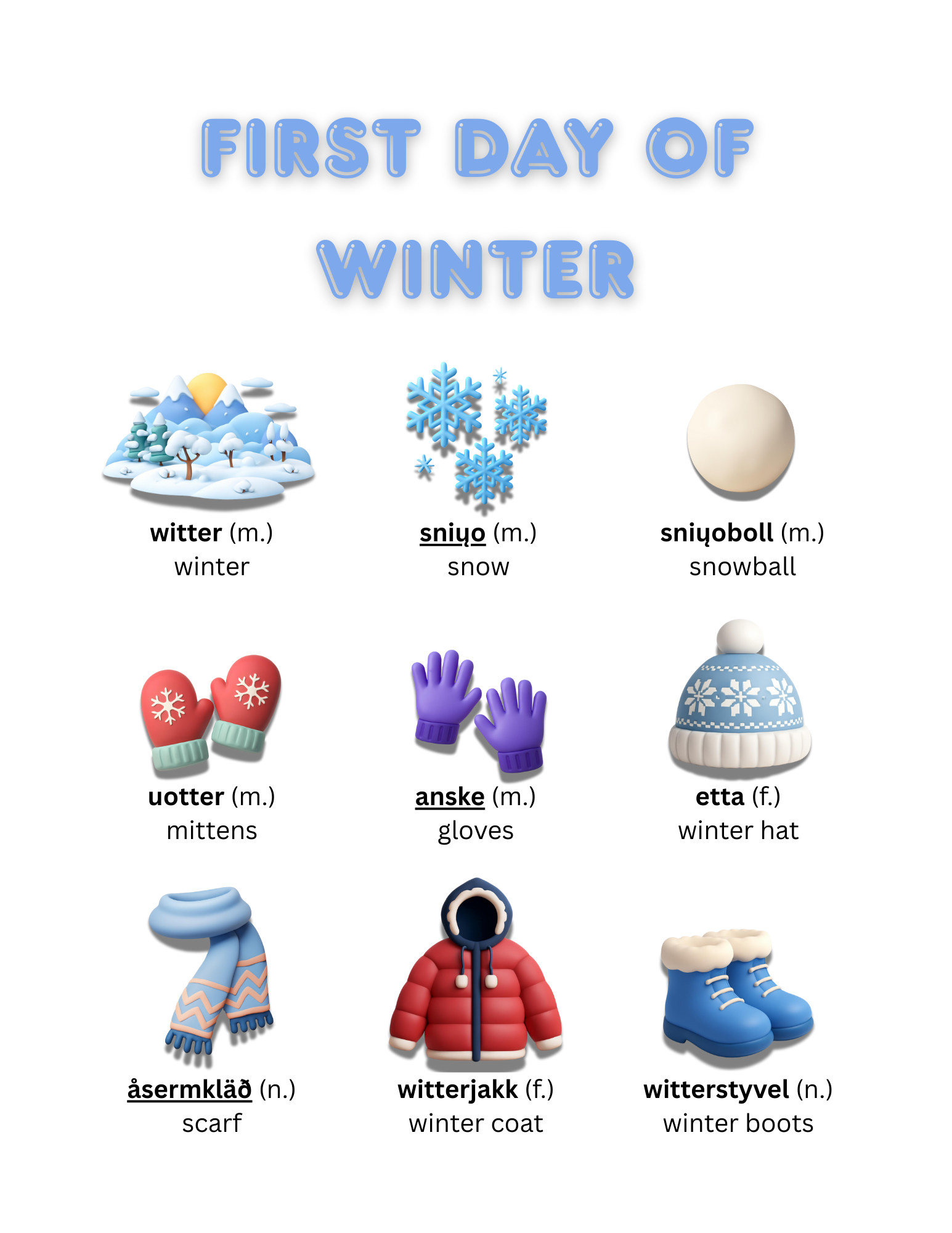 Now, that I’ve gotten your attention, it’s the first day of winter, so how about starting the official season by learning some winter related vocabulary in one of 12 Nordic languages: