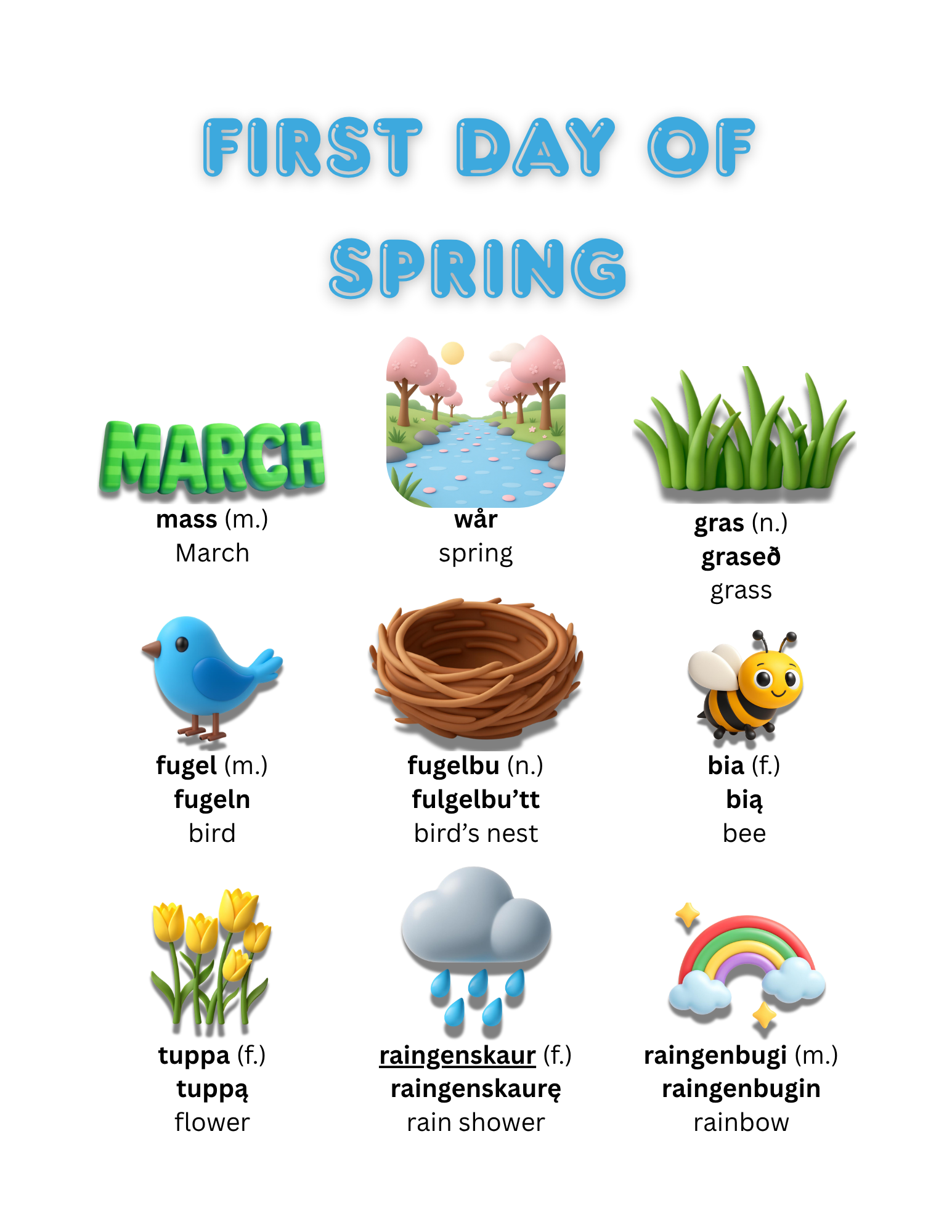 Either way – why not start your spring off right? Check out these latest vocabulary lists curated for the First Day of Spring. As usual, these lists are available in 14 Nordic languages (click on each language to be taken directly to that list):